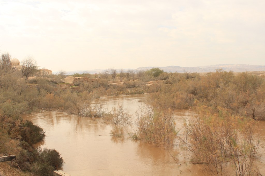 Ci siamo recati in questo luogo perchè volevamo assolutamente “toccare” il fiume Giordano. Non perchè qualcuno di noi fosse particolarmente credente, ma perchè ci sembrava un’esperienza abbastanza imperdibile. Per di più, il Giordano segna da nord a sud il confine tra la Giordania e i territori occupati da Israele. Insomma, questo fiume ha un fascino tutto particolare. Abbiamo scoperto che il luogo dove si dice che Gesù sia stato battezzato è l’unico, almeno in Giordania, dove è possibile avvicinarsi a pochissimi metri da Israele. Vi assicuro che la sensazione è assurda, almeno per noi occidentali abituati ad un concetto di confine abbastanza astratto. Ci si trova infatti a pochissimi metri dall’altro stato e si ha la netta sensazione che quelle acque, non più larghe di 50m da una sponda all’altra, in questa stagione di abbondati piogge, quindi una decina di metri durante l’estate, siano un vero e proprio muro divisorio. Ci si potrebbe parlare da una sponda all’altra senza problemi, ma nessuno osa farlo. Da una parte e dall’altra le guardie controllano le sponde e anche se sembra che tutto sia tranquillo, si percepisce un’atmosfera densa di significati.